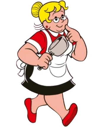 Lady aged 50/60, with blonde hair in a bun, half-moon glasses, red shirt, black skirt or a dress and a white cook's apron. Affectionate, sincere, talented, kind and protective.